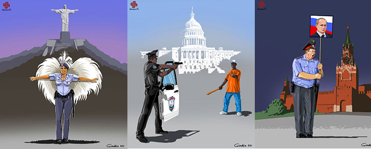Illustrations by Gunduz Agayev depict police officers in the countries where human rights are abused, such as Russia, Great Britain, USA, China, Turkey, Korea, Sudan, Saudi Arabia, India, etc. Most of the illustrations are sarcastic and critical, while some of them visualize “good police” characters. More info in Facebook.