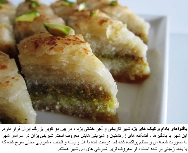 It is famous for its badgirs (wind catchers), ancient Zoroastrian temples and glorious selection of bite-sized pastries known as Shirini Yazdi (Yazdi sweets). Patisseries throughout the city stock an assortment of these sugary treats, from almond baklavas, to cupcakes made cardamom and pistachios and ghotab, a local delicacy of deep fried doughnuts filled with ground almonds.