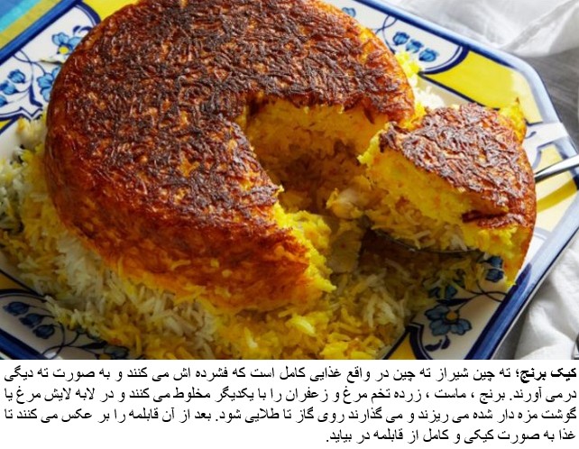 The dish is then turned upside down and served like a cake, from which you cut yourself a very generous slice. Tahchin is found in restaurants throughout the city of Shiraz, where it considered something of a speciality.