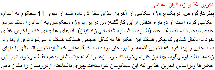 Peter hargroves, in a Photography project of the last meal ordered from the 11 sentenced to death, took photos and he said about the themselves purpose, in this project I have seen the sentenced to death as ordinary peoples – they are not as a number – (refer to ID Prisoners). Normal people will a few happy that they find in themselves meals. Mouthfuls are the end of connection with the world. ‘In the most unnatural moment there is (state sponsored death) what kind of requests for food had been made?’ He goes on: ‘In New Zealand (where I’m from), and in fact nearly any where else in the developed world, the Death Penalty is just not even in the conversation. It is a remnant of an earlier era.’ ‘This little bit of civility, “hey we are going to kill you but what would you like to eat?” just jumped off the page. I felt it could be a really interesting idea to try to represent visually.’