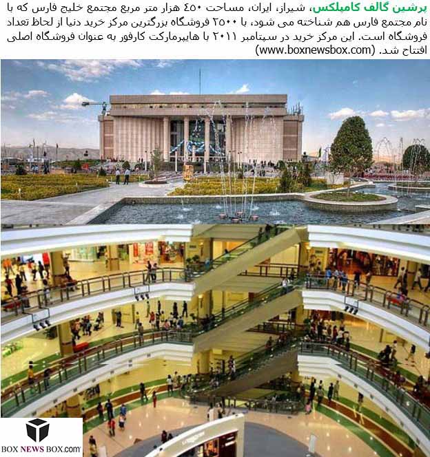Located in Shiraz, one of the largest cities in Iran, Persian Gulf Complex is the biggest mall in the world in terms of a number of shops. It has more than 2500 stores spread over 450,000 square meters. The mall was opened in 2012.