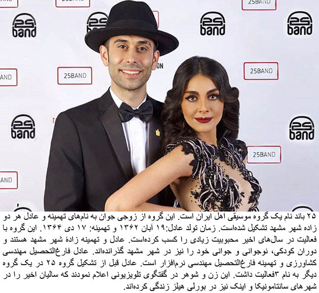 25band is a music band originating from Mashhad. The band was formed in 2010 by Tamin along with A-del as the vocalists. The name 25band means Tus, the city that the couple are from. 2 and 5 because of its resemblance of S.