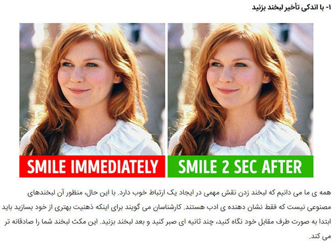 We all know that smiling is very important for good communication. However, it’s not about that plastic smile that shows simple politeness. Leil Lowndes explains the way to leave a better impression: first, look at another person’s face, wait for a few seconds, and only then smile. This pause will make your smile more sincere.
