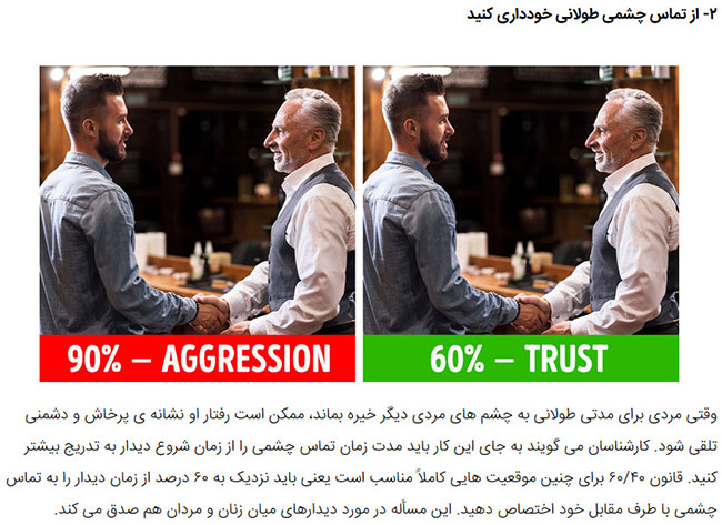 Based on research, Lowndes claims that when a man looks into another man’s eyes for a long time, it can be interpreted as aggression. Instead, she advises that you gradually extend the time of visual contact from the beginning of meeting someone. The rule of 60/40 will work perfectly in this instance — make eye-contact for approximately 60% of time. The same is true for relations between men and women.