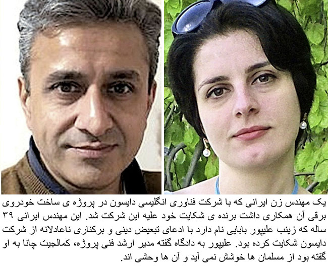 An engineer who helped develop Sir Richard Dyson’s electric car has won a religious discrimination and unfair dismissal claim against the company after her manager told her ‘I don’t like Muslims’. Zeinab Alipourbabaie (left) told a tribunal that senior technical project manager Kamaljit Chana (right) also said: ‘Muslims are violent’ and ‘Pakistani men are grooming our girls.’