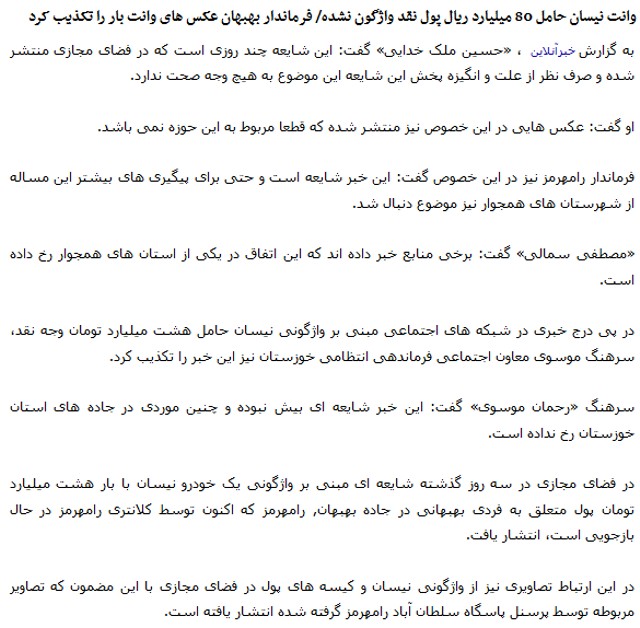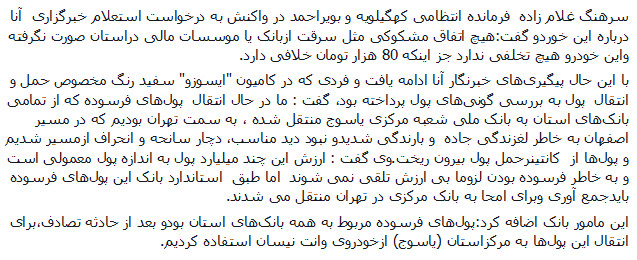 There have been conflicting reports about a truck filled with bags of money totaling 8 billion tomans was spotted due to a accident in the kahkiluye province. ANA news agency first reported the news and continued to say, that there where no reports of bank robberies in the area. On the other hand khabaronline several days later reported that this news is all rumors and not true and that the local officials are not aware of any such incident.