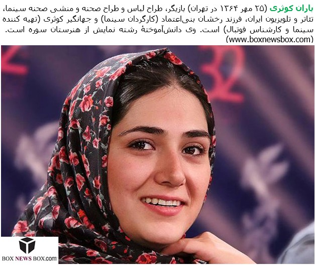 Baran Kosari (born 17 October 1985) is a Crystal Simorgh winning Iranian actress. She is the daughter of director Rakhshan Bani Etemad, and film producer Jahangir Kosari.She graduated from Soureh academy. The Best Papa of the World (1991) is her first acting experiment. She had appearances in some of her mother’s films, Nargess” (1991), Rusari-ye Abi (The Blue-Veiled)” (1994), May Lady” (1997), Kish Stories” (Rain and Ladsman episode – 1998), Under the Skin of the City (2000), Our Times (documentary – 2001). In 2007 she was nominated for the best performance by an actress in Asia Pacific Screen Award for her performance in Mainline.Baran Kosari also ascertained her abilities as a theater actress with playing in “Over the Mirror” (1997), with Azita Hajian directing.