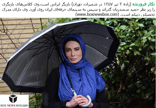 Negar Foroozandeh born 1979 is an Iranian actress. Among her many films are Ekhrajiha and Dayere Zangi.She has worked with many famous Iranian directors such as Dariush Mehrjui, Masoud Kimiai, Ebrahim Hatamikia and Parisa Bakhtavar.