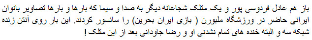 The video shows a funny commentary by Adel Ferdosipour about our national team fans in Melbourne during the game with Bahrain. Adel makes references to the images of women that get censored by national TV during the live broadcasts. All Local TV stations in the country are government run. Adel FerdosipourĀ is a football commentator, journalist, and also host of the sports television show “90”. His show has been on the air for 15 years now and isĀ known to be controversial due to it’s honestly and sometime brutal commentaries and reports. Our’s next game in the Asian games will be on Thursday against Qatar.