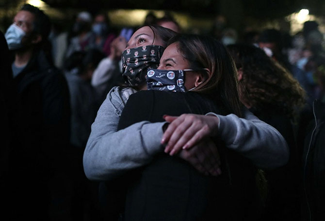 Two women hug in McPherson Square in Washington, DC, on November 7, reacting to news that President-elect Biden won the presidential race.