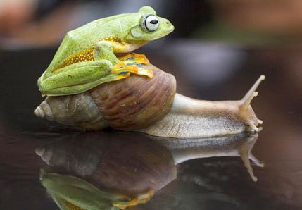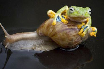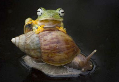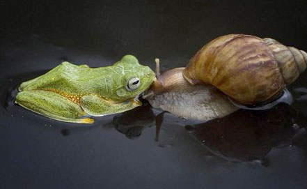 Indonesian photographer won a rare and wonderful images from a friend with a snail is a small frog. This little frog strangely eager to establish rapport with a large African snail, which is a Terrestrial. “Hindi Amp” 25-year-old photographer, this unusual and rare moments with his camera and he has took the photos when he was in the forests near his home in the region, “Sambass” Indonesia. According to Xinhua, Hindi has been prepared for the pictures of incredible friendship from a distance of 30 cm and the frog and snail were playing together.