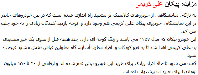 The Paykan was an automobile produced by IRKhodro. The car was very popular from the late 1960s to the late ’90s. The Paykan design was based on the 1967 Hillman Hunter, which was originally designed and manufactured by the British Rootes Group. There was some news made last week about Ali Karimi’s Paykan being sold in a charity auction. Mohammad Ali Karimi Pashaki born 8 November 1978 is a retired homeland footballer. He has played for Fath , Persepolis, Al-Ahli Dubai, Bayern Munich, Qatar SC, Steel Azin, Schalke 04, Tractor Sazi, and the national team for which he scored 38 goals in 127 appearances. In 2004 he became the fourth homeland player to win the Asian Footballer of the Year. He announced his retirement at the end of the 2013–14 season and, on 11 April 2014, played the final game of his 18-year career.Karimi’s professional career began with Fath , where he made his first-team debut in 1996 aged 18. He then played three seasons with Persepolis, winning the Iranian league twice and the Hazfi Cup once with the club.