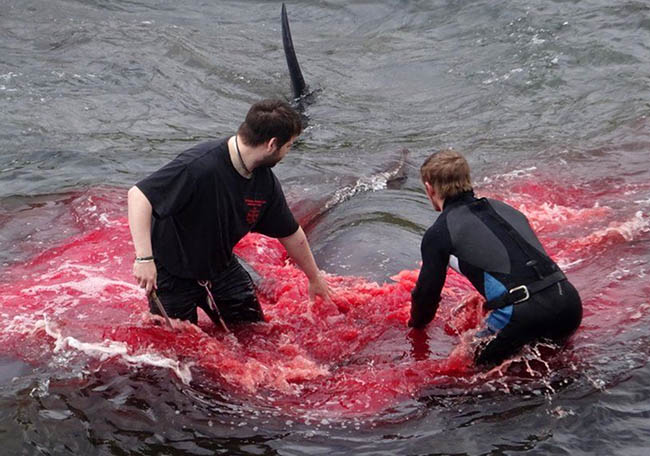 [custom_adv] THIS is the horrifying moment an Atlantic bay was turned red with blood as villagers butchered hundreds of whales in the Faroe Islands.