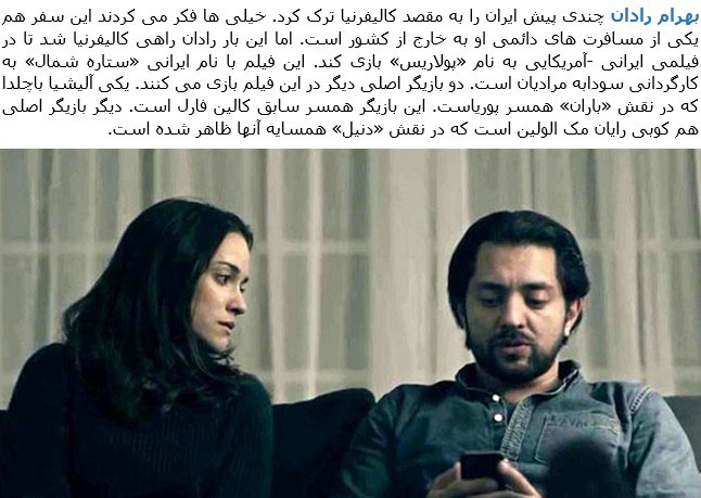 Psychologically traumatized war photographer is locked in a desperate struggle to protect her secrets and escape her inevitable return to the Middle East. Bahram Radan has been movie star for more than 15 years, recently he appeared in “Polaris” movie, which is an English-language movie. The “Polaris” was filmed in California.