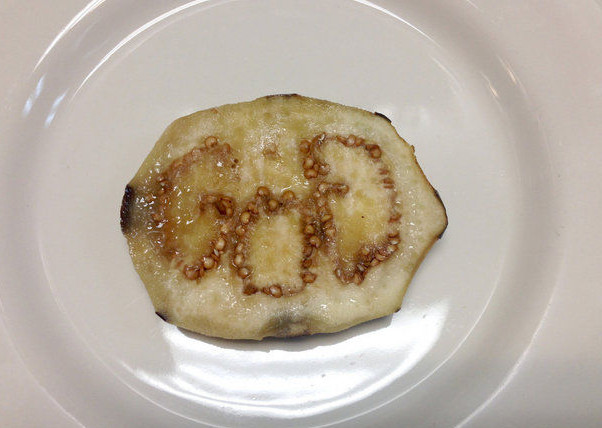 A Baton Rouge restaurant is getting a flurry of media attention after one of its cooks found the word “GOD” legible in the seeds of an eggplant during dinner prep Monday. Jermarcus Brady had already sliced and begun sautéing about five eggplants at Gino’s Restaurant when he noticed the seed configuration. Since photos of the eggplant slice appeared on personal Facebook accounts of the employees on staff that day, restaurant co-owner Gino Marino said “it’s crazy” the number of calls they’ve received from local and national media. The story has since been picked up by Fox, the Huffington Post, CNN, and Eater.
