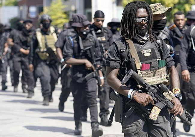Louisville Metro Police in riot gear set up barricades to keep the two militias on opposite sides of Fifth Street.