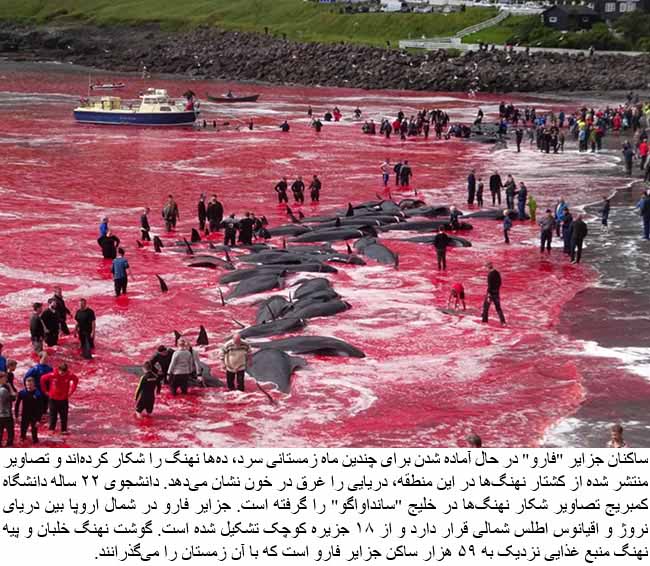 THIS is the horrifying moment an Atlantic bay was turned red with blood as villagers butchered hundreds of whales in the Faroe Islands.
