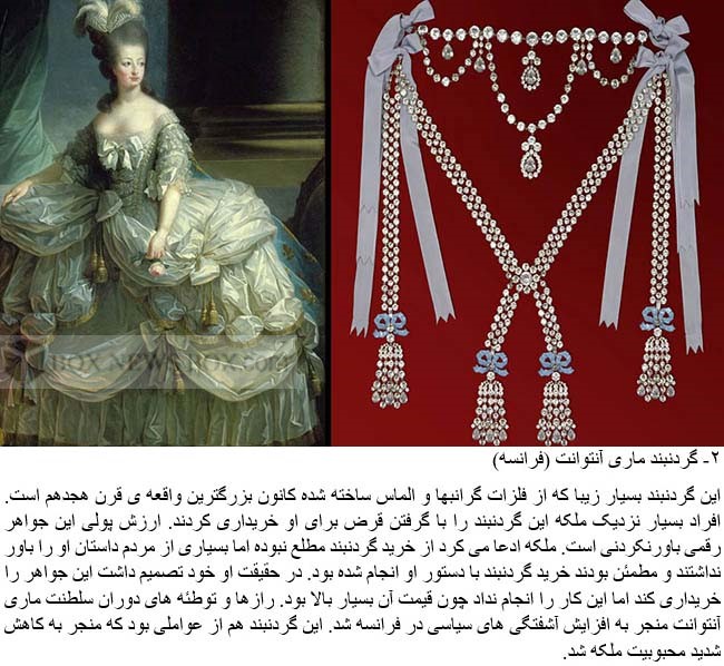 This incredibly beautiful necklace which consists of precious metals with diamonds was the the center of the biggest incident in the 18th century. People very close to the Queen bought this necklace with loans and it cost an unbelievable amount of money. The Queen claims to not have know anything about the purchase but many people didn’t believe her story and were sure she ordered them to buy it. She had actually wanted to purchase this necklace herself, but she didn’t because the price was too high. There was a huge amount of mystery and deception surrounding Marie Antoinette which led to an increase in political unrest in France. The Queen was thought to be involved in an extramarital affair but nothing was ever confirmed. In the end, this necklace was one of the factors leading to a huge decline in her popularity as queen.