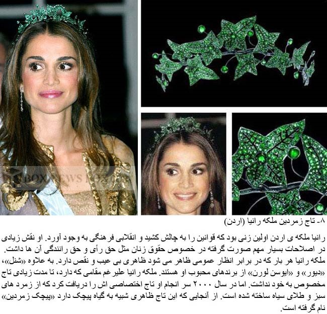 Queen Rania of Jordan is a wonderful woman. She was one of the first women who openly went public, challenged the rules, and created a cultural revolution. She played a huge role in very important women’s rights reforms including their right to vote, their right to drive a car, and the right to choose their own clothes. Every time Queen Rania appears in public, she looks flawless. “Chanel,” “Dior,” and, “Yves Saint Laurent” are among her favorite brands. Despite her status, she didn’t have her own crown for a long time. But in 2000 the Queen of Jordan finally got her own crown — a tiara made of emeralds and black gold, made by “Boucheron.” This piece of jewelry is called “the Emerald Ivy” because it looks similar to the ivy plant.