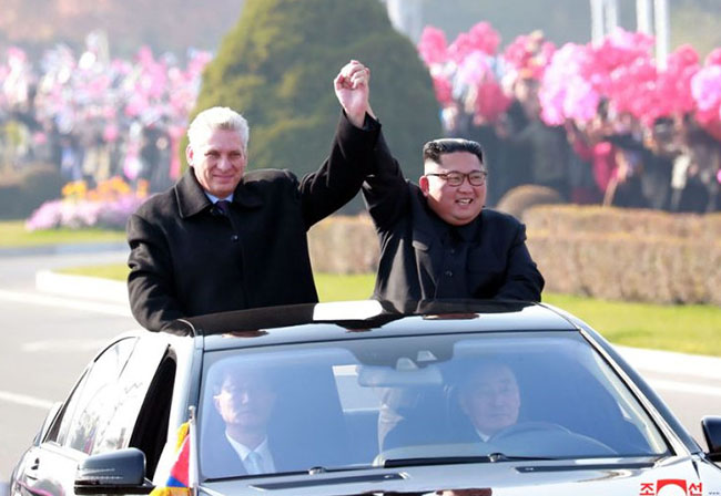 Diaz-Canel, who is in Asia on his first international tour since assuming office in April, arrived in Pyongyang with his wife on Sunday. He was met at the airport by Kim, who joined him on the ride into the city past flower-waving and cheering crowds.