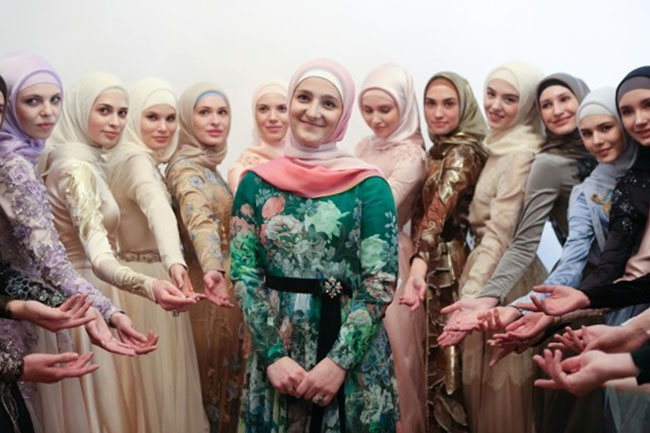 In a former czar’s palace in Moscow, models display a fashion collection designed by the 18-year-old daughter of Ramzan Kadyrov, leader of Russia’s mainly Muslim region of Chechnya.