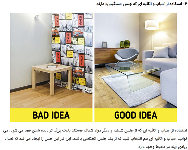 Furniture made of glass and other transparent materials will make your space look bigger. You can also choose reflective surfaces that will make it seem like there are a lot of mirrors.