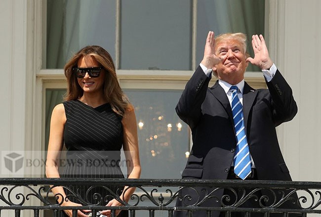 The president was joined by wife Melania, son Barron and top aides Monday afternoon to view the spectacle from the portico overlooking the South Lawn. The White House originally said Trump would watch from the second-floor Truman balcony.