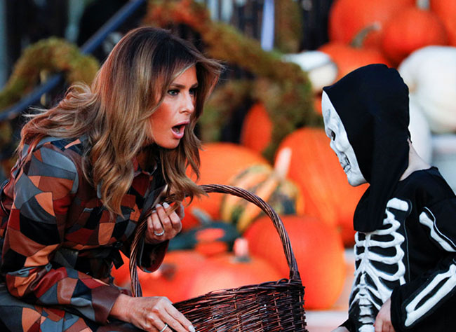 One day after being tricked — so to speak — by World Series spectators, President Donald Trump stood outside the White House to treat costumed children on Monday.