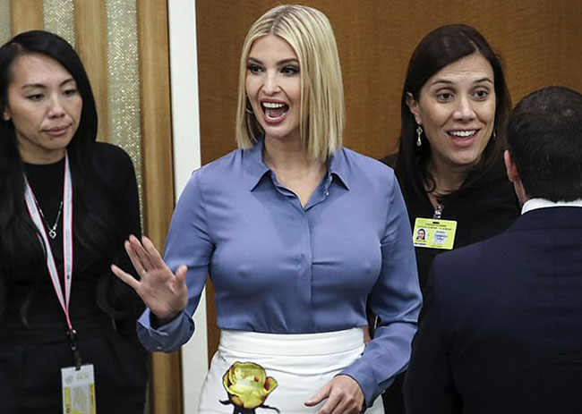 Ivanka paired the pricey skirt with a form-fitting blue silk button-up that was tucked into the slim-fit design, and added a pair of simple black pointed-toe heels.