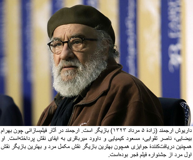 Dariush Arjmand (born 27 July 1944 in Mashhad, ) is an actor. A son of a military father and a housewife mother, he was born in Mashhad and grew up in Mashhad. He started performing in plays at the age of 12. At the age of 26, he started working for the Ministry of Art and Culture. In the meantime, is a Crystal-Simorgh winning actor.After many years of performing in theatre, he started his film acting career by appearing in Captain Khorshid (1986, Nasser Taghvaee), which was awarded the Crystal Simorgh for the best leading role at the Fajr International Film Festival.