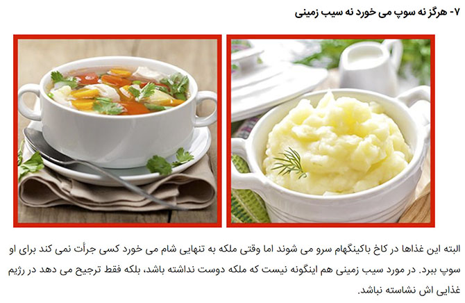 Of course, these dishes are served in Buckingham Palace but when the queen has dinner alone no one would dare to bring her soup. As for potatoes, it’s not that she doesn’t like them, she just prefers to avoid starch in her diet.