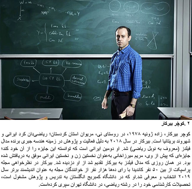 Caucher Birkar FRS (born Fereydoun Derakhshani July 1978, in Marivan County, Kurdistan) is a UK-based mathematician and a professor at the University of Cambridge. Birkar is an important contributor to modern birational geometry. In 2010 he received the Leverhulme Prize in mathematics and statistics for his contributions to algebraic geometry, and in 2016, the AMS Moore Prize for the article “Existence of minimal models for varieties of log general type”, Journal of the AMS (2010) (joint with P. Cascini, C. Hacon and J. McKernan).