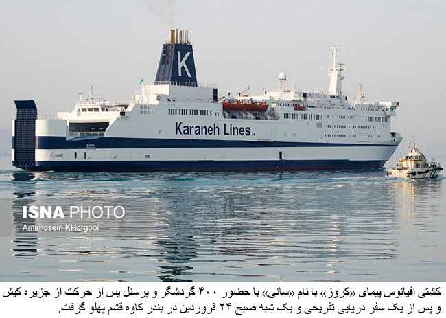 Carrying 400 passengers and crew members, the ocean liner is expected to leave Kish in the evening and arrive at Qeshm on Thursday morning.