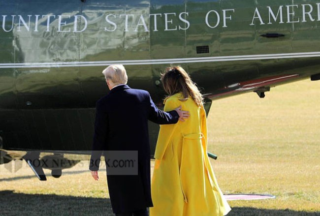 Melania sported an attention-grabbing canary yellow full length overcoat as the pair paraded by a bank of reporters and photographers – who have been closely watching the state of the First Family’s marriage since a bombshell report that Trump lawyer Michael Cohen had paid $130,000 to adult film star Stormy Daniels, who claimed in earlier interviews she had an affair with Trump.