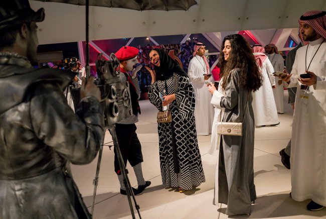 A visitor takes pictures of posters of Hollywood movie stars during an invitation-only screening at the King Abdullah Financial District Theater, in Riyadh, Saudi Arabia, Wednesday, April 18, 2018. Saudi Arabia held a private screening of the Hollywood blockbuster “Black Panther” Wednesday, to herald the launch of movie theaters that are set to open to the public next month.
