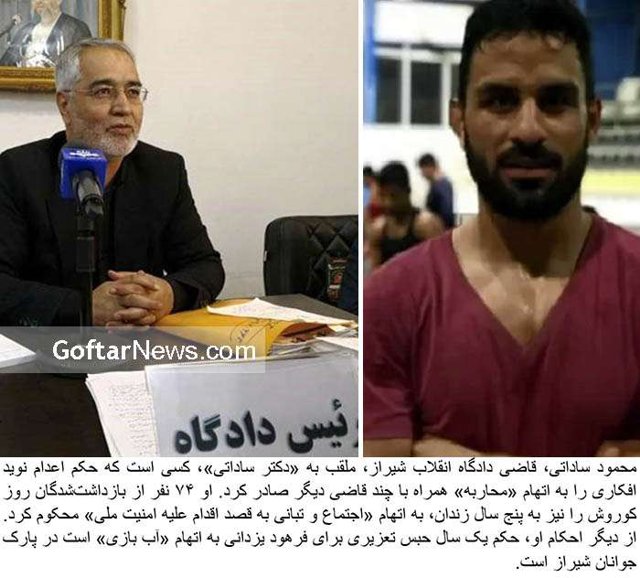 Mahmoud Sadati, the judge of the Revolutionary Court, nicknamed “Doctor Sadati,” is the one who issued the death sentence to Navid Afkari on charges of “warfare,” along with several other judges. He also sentenced 74 people arrested on Rooz Korosh to five years in prison on the charge of “assembly and collusion with the intention of acting against national security.” Among his other sentences, Farhoud Yazdani was sentenced to one year in prison for “playing with water” in Shiraz Youth Park.