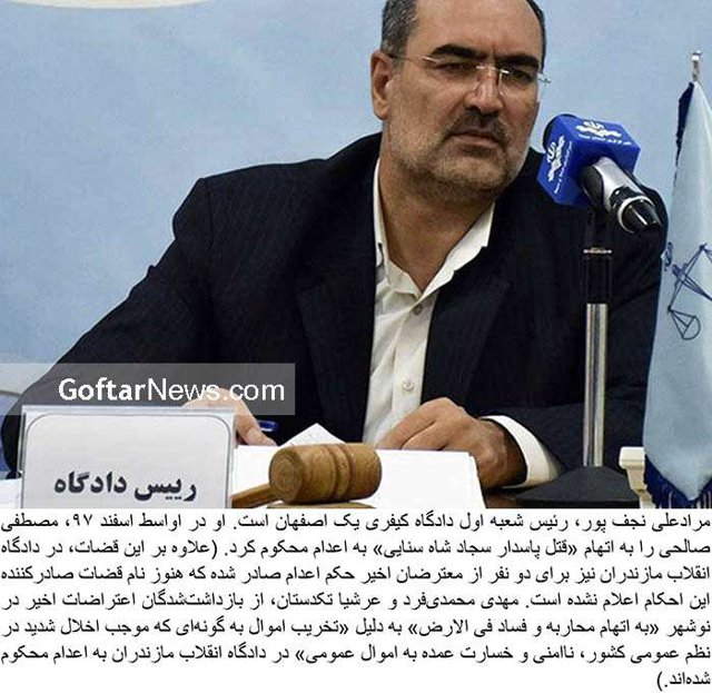 Murad Ali Najafpour is the head of the first branch of Court No. 1. In the middle of March 2017, he sentenced Mustafa Salehi to death on the charge of “murdering guard Sajjad Shah Senai.” In response to Mustafa Salehi’s refusal to accept the murder, Mohammad Reza Tawakli, the prosecutor of Najaf Abad, said: “This person was trained, and for that reason, he did not accept the criminal act, but our investigation proved.” (In addition to these judges, two of the recent protesters were sentenced to death in the Mazandaran Revolutionary Court, but the names of the judges who issued these sentences have not yet been announced. Mehdi Mohammadifard and Arshiya Takdestan, among those arrested in the recent protests in Nowshahr “on the charge of muharibeh and corruption in the earth” due to “the destruction of property in a way that caused severe disturbance in the country’s public order, insecurity, and major damage to public property,” were sentenced to death in the Mazandaran Revolutionary Court.