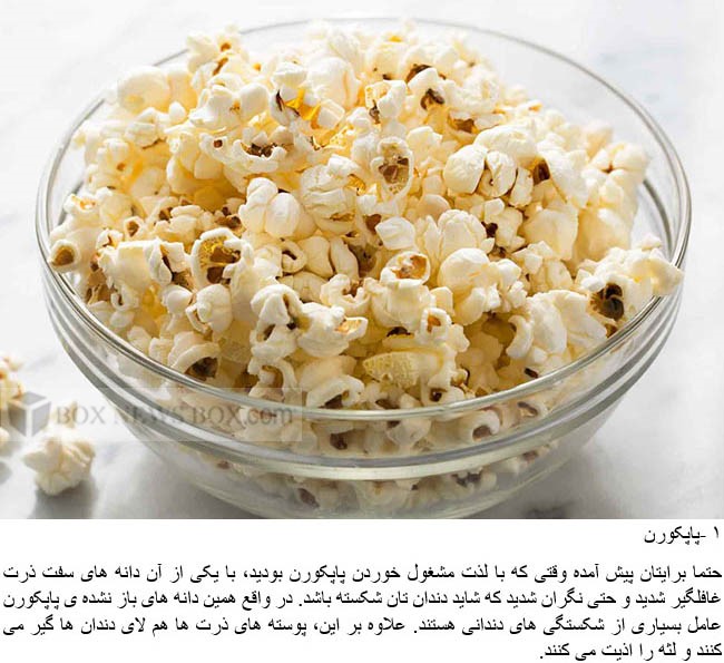 Put down that bowl of microwave popcorn, friends. “Countless number of people come in with cracked teeth from eating half-popped popcorn kernels, not to mention the sneaky husk,” says Jonathan Neman, DDS, a dentist in New York City “Popcorn husk is notorious for finding its way in between teeth and causing gum pain, too.”