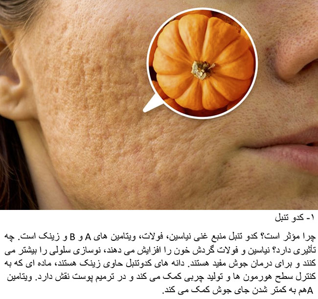 Why it works: Pumpkin is a great source of niacin, folate, A and B vitamins, and zinc. What it does: Niacin and folate increase blood circulation, improve cell renewal, and are beneficial in treating acne. Pumpkin seeds contain zinc, which helps control hormone levels and oil production and assists with the healing of the skin. Vitamin A helps minimize acne scars.