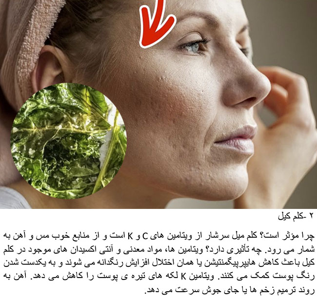 Why it works: Kale is rich in vitamins C and K and is a good source of copper and iron. What it does: The vitamins, minerals, and antioxidants in kale reduce hyperpigmentation and help to even out your skin tone. Vitamin K works to reduce dark spots on your skin. Iron speeds up the healing of wounds or scars, including acne scars and blemishes.