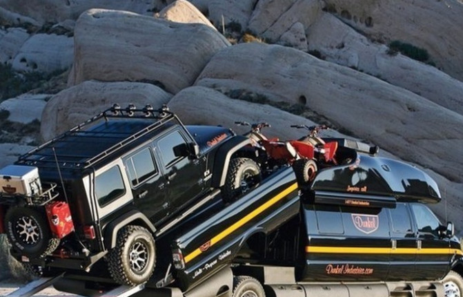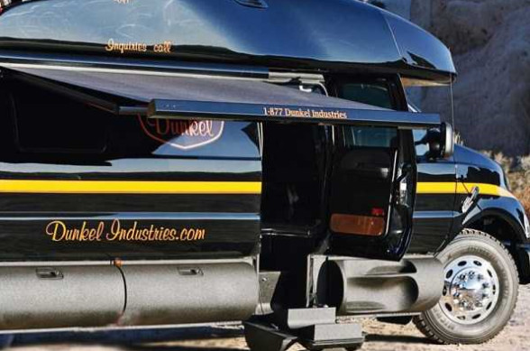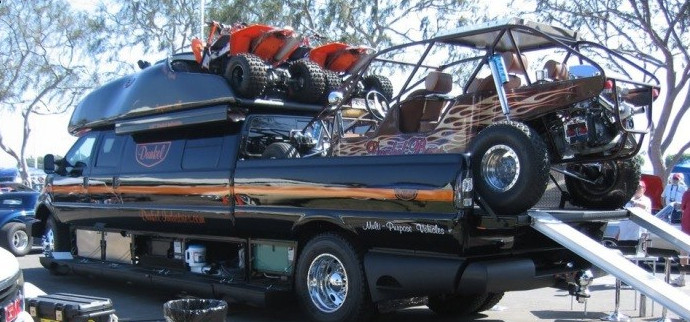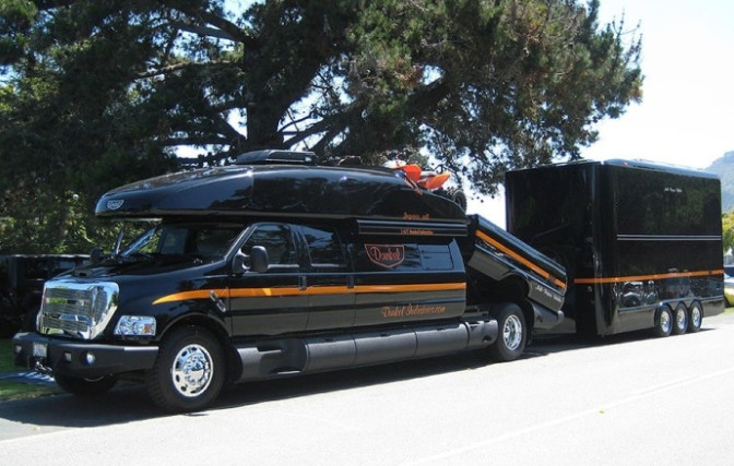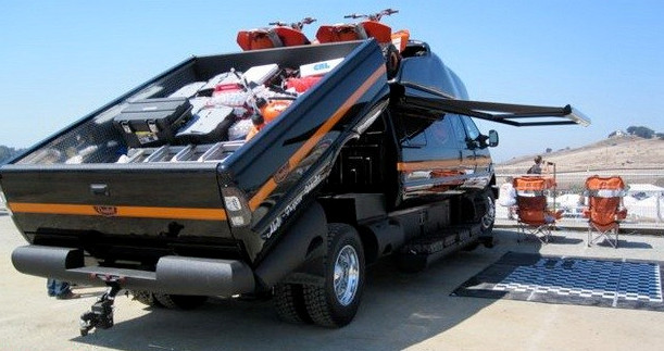 The great thing about SEMA that otherauto shows can’t boast of is that you can find vehicles that are so out of the ordinary it begs for more than a few double takes. Take this truck from Dunkel Industries for example. Check out the world’s Biggest Truck Ford F-750 Luxury Truck by Dunkel Industries. Dunkel Industries’ Luxury 4×4 – the largest pickup truck we’ve ever seen at SEMA. It’s 8.5 feet wide, 32 feet long and almost 12 feet tall! The Dunkel 4×4 is an RV and pickup fused together. It’s built on a Ford F-650/F-750 chassis with a bed that’s big enough to fit a full-size car with room on the top for dirtbikes. There’s no need to tow a trailer!