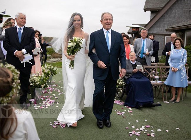 The bride, who wore an ivory silk crepe Vera Wang custom gown, was escorted down the aisle by her father, former President George W. Bush, with her grandfather, former President George H.W. Bush, watching nearby.The bride’s aunt, Dorothy Bush Koch, officiated the ceremony.