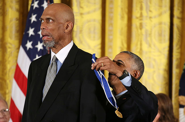 US President Barack Obama awards the Presidential Medal of Freedom to NBA star Kareem Abdul-Jabbar (L) in the East Room of the White House in Washington on 22 November 2016