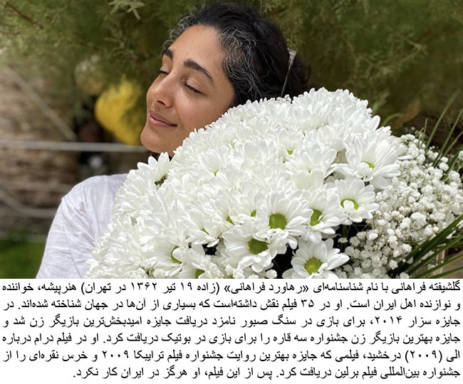 Golshifteh Farahani (born 10 July 1983) is an actress and singer. She has appeared in 35 films, many of which have received international recognition.