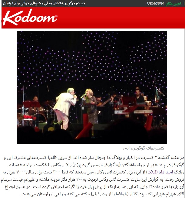 The joint Ebi and Googoosh concert and a separate Shahram Kashani show during the past few weeks have had a lot of controversies surrounding them. Kodoom.com and the weblog activist Omid Dana have covered the topics and rumors.