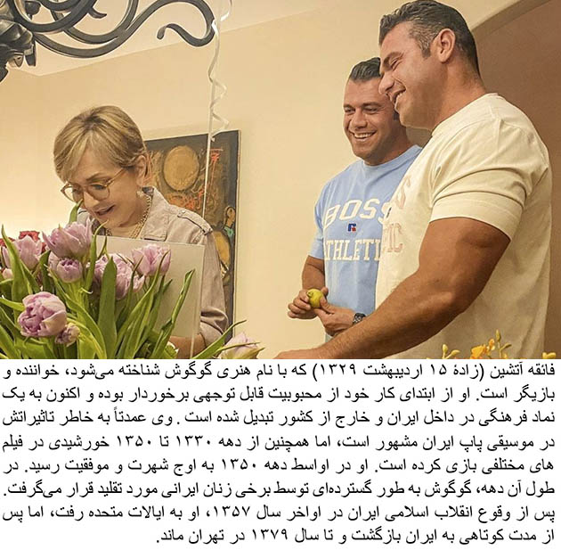 Faegheh Atashin (born 5 May 1950), known professionally as Googoosh is a singer and actress, and one of most popular and enduring entertainers, whose career spans over 60 years. Googoosh has enjoyed significant popularity since the beginning of her career, ultimately becoming a cultural icon inside and abroad.