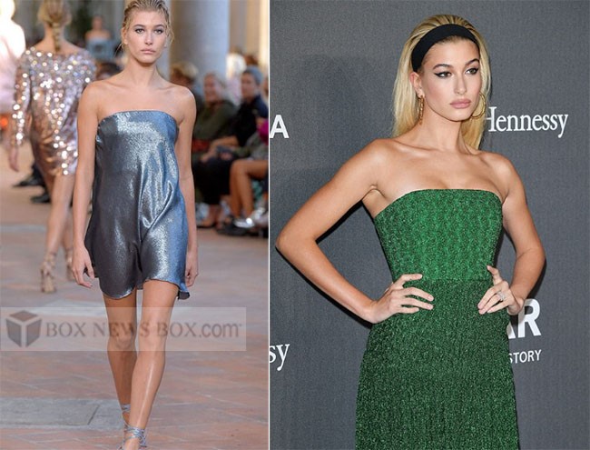 The IMG beauty wasn’t afraid to flaunt her assets on the runway, sporting a shimmering dress which revealed all of her breast bone and awesome abs with a bikini-like bodice and only criss-crossing straps across her middle.