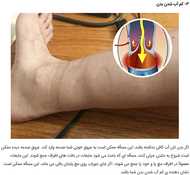 If your body doesn’t get enough water, it may damage your blood vessels. Damaged veins may begin to create small leaks that allow fluid to build up in the surrounding tissue. Common places for this fluid to be collected are around the ankles and feet. Sock marks that appear around your ankles may indicate that your body is dehydrated.