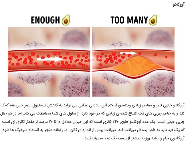 Avocados contain fiber and a great deal of vitamins. It can also help you lower bad cholesterol (LDL) and maintain your cells due to their high content of monosaturated fats. But fat still remains fat. A single avocado contains 240 calories which is about 10%-20% of a person’s ideal calory intake and ingesting too many calories can lead to artery-clogging problems. One should stick to about half or 1 avocado a day if eaten raw (so not avocado chips, for example).