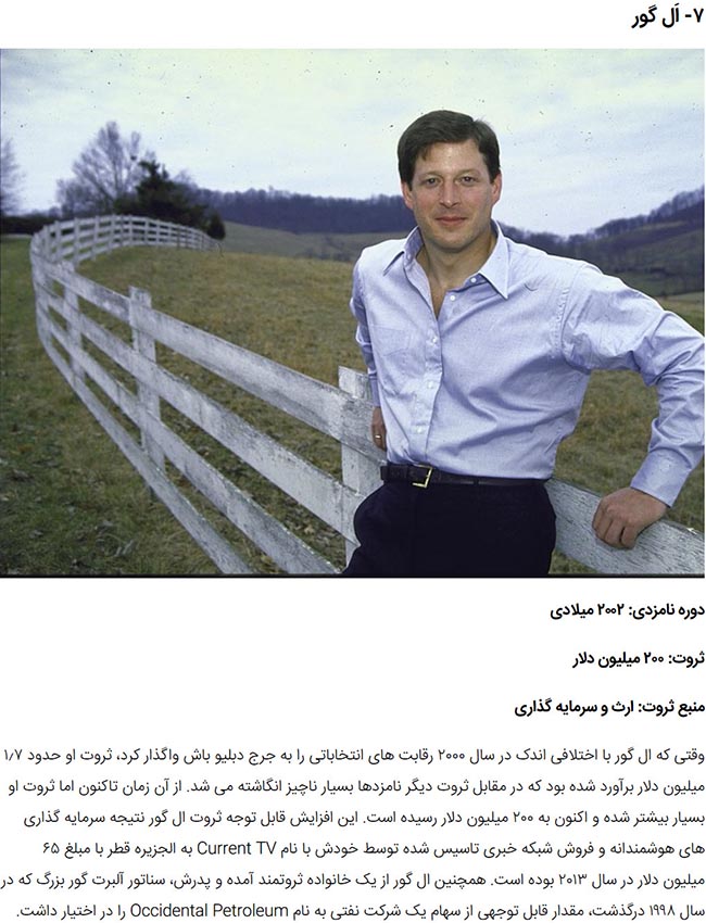 When Al Gore narrowly lost to George W Bush in the 2000 presidential election, he was worth about $1.7 million — a paltry sum by the standards of other contenders on the list.But in the years since, his wealth has ballooned, according to Bloomberg, to an estimated $200 million. This is owing to savvy sustainable investments and the sale of a news network he founded, Current TV, to Qatari-based Al Jazeera for an estimated $65 million in 2013.
